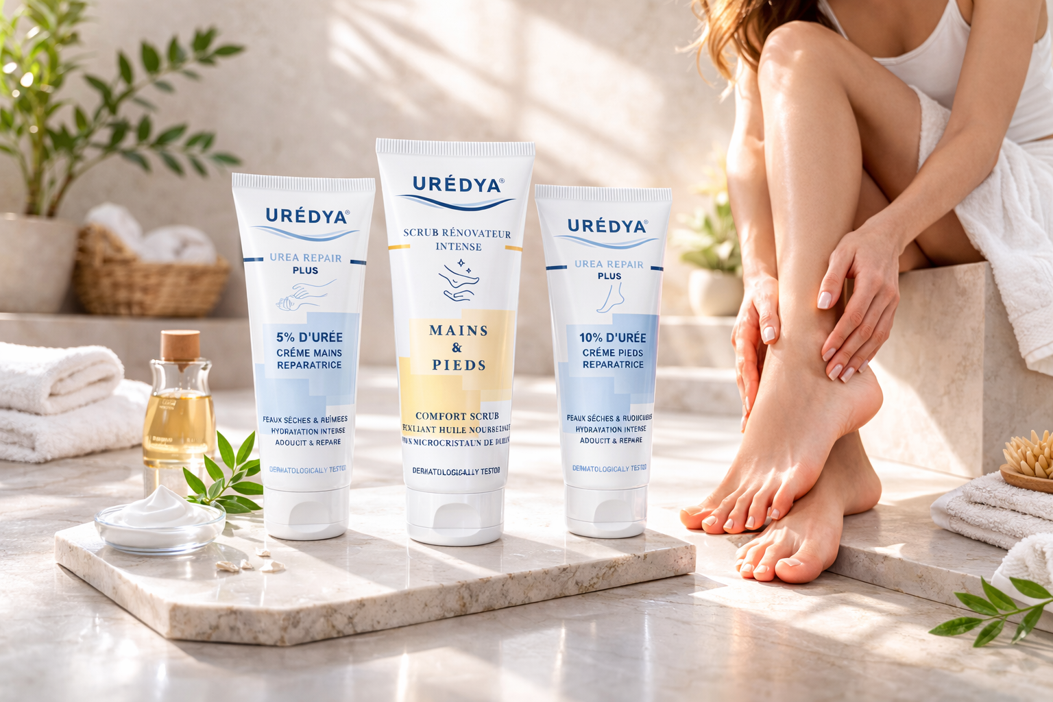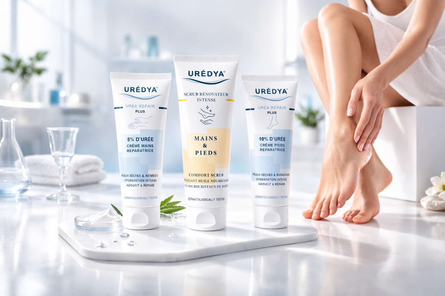 Formules enrichies en urée pour restaurer durablement l’hydratation et améliorer la souplesse cutanée.